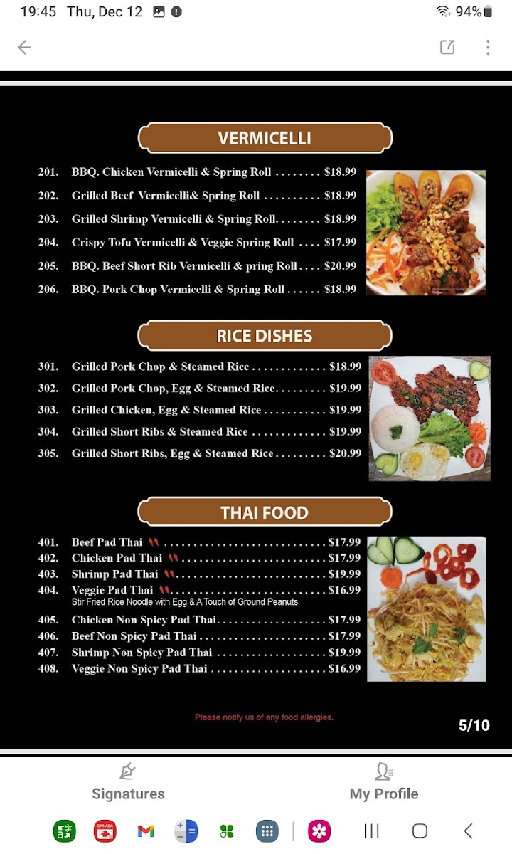 The menu also includes sumptuous rice dishes such as the Grilled Pork Chop and Short Ribs, making for hearty meals at reasonable prices ranging from CA$18.99 to CA$20.99. Don't forget to pair your meal with a refreshing Vietnamese iced coffee or a selection from their extensive beverage list, featuring both soft drinks and local beers.